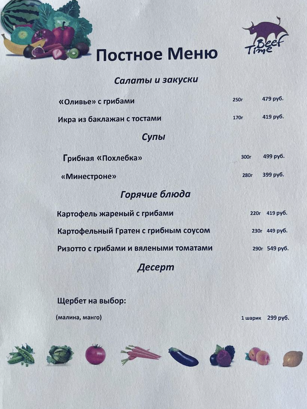 На ваш выбор нежный стейк Рибай, стейк Стриплойн или "Топ-Блейд", салат, гарнир, соус, красное вино 0,1л или пиво Beeftime 0,5л или морс 0,2л.